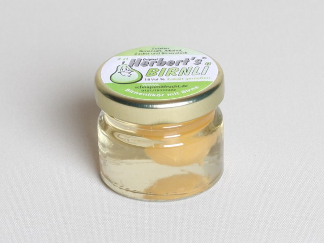 Birnensaft, Alkohol (18%), Zucker und Birnenstück